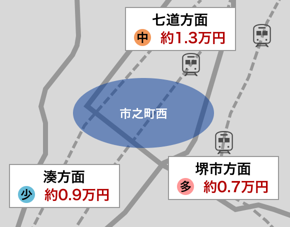 市之町西エリア周辺は、湊方面、七道方面、堺市方面の3つのエリアに分けることができます。