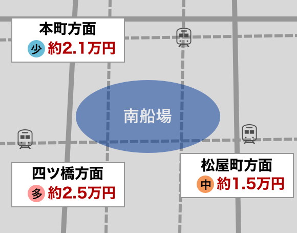 賃料相場で見ると最も相場価格が高いのは四ツ橋方面で約2.5万円、最も相場価格が低いのは松屋町方面で約1.5万円の駐車場があります。
