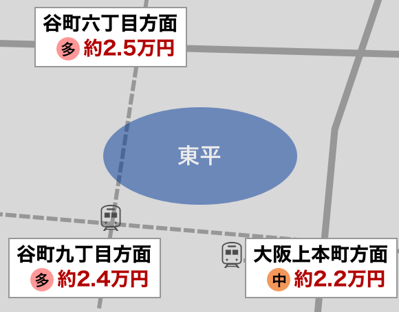東平エリア周辺は、谷町九丁目方面、大阪上本町方面、谷町六丁目方面の3つのエリアに分けることができます。