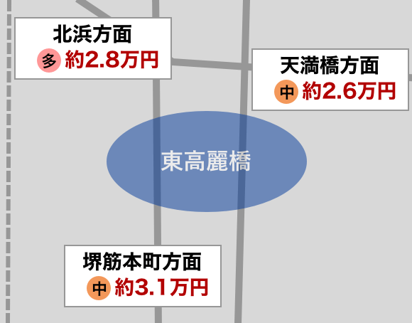 賃料相場で見ると最も相場価格が高いのは堺筋本町方面で約3.1万円、最も相場価格が低いのは天満橋方面で約2.6万円の駐車場があります。