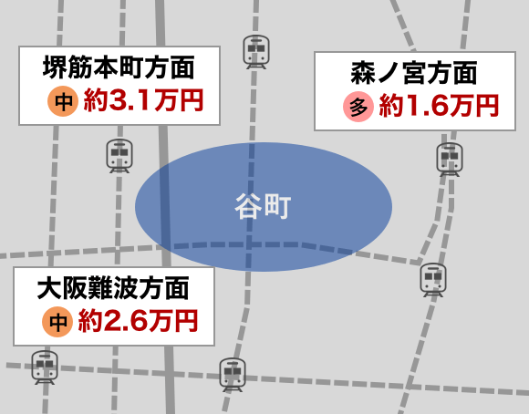谷町エリア周辺は、大阪難波方面、堺筋本町方面、森ノ宮方面の3つのエリアに分けることができます。
