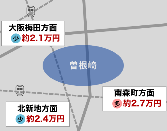 曽根崎周辺には3件の月極駐車場があり、相場価格は33,000円です。最高賃料は49,500円、最低賃料は23,100円です。