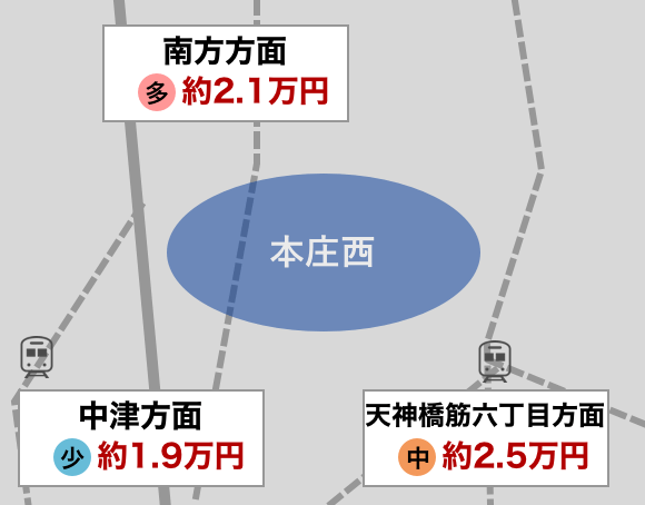 本庄西エリア周辺は、中津方面、天神橋筋六丁目方面、南方方面の3つのエリアに分けることができます。