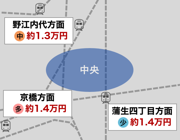 中央エリア周辺は、蒲生四丁目方面、京橋方面、野江内代方面の3つのエリアに分けることができます。