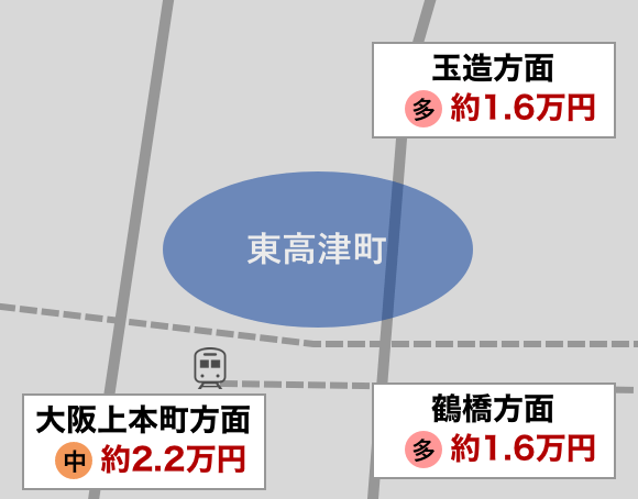 東高津町エリア周辺は、鶴橋方面、大阪上本町方面、玉造方面の3つのエリアに分けることができます。