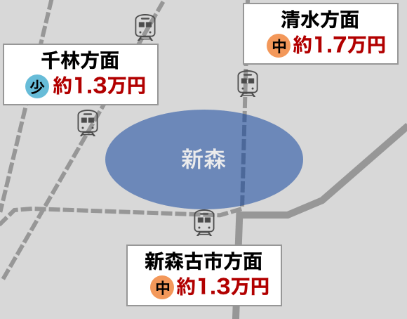 賃料相場で見ると最も相場価格が高いのは清水方面で約1.7万円、最も相場価格が低いのは千林方面、新森古市方面で約1.3万円の駐車場があります。