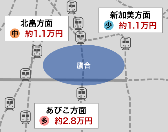鷹合エリア周辺は、新加美方面、あびこ方面、北畠方面の3つのエリアに分けることができます。