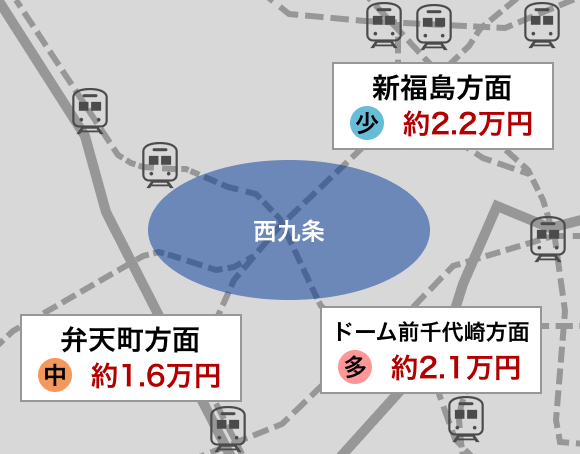 賃料相場で見ると最も相場価格が高いのは新福島方面で約2.2万円、最も相場価格が低いのは弁天町方面で約1.6万円の駐車場があります。