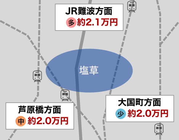 塩草エリア周辺は、大国町方面、JR難波方面、芦原橋方面の3つのエリアに分けることができます。