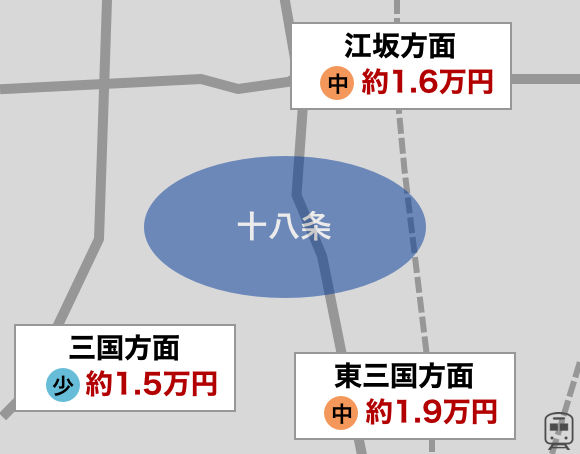 十八条エリア周辺は、東三国方面、三国方面、江坂方面の3つのエリアに分けることができます。