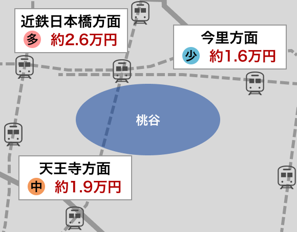 桃谷エリア周辺は、今里方面、近鉄日本橋方面、天王寺方面の3つのエリアに分けることができます。