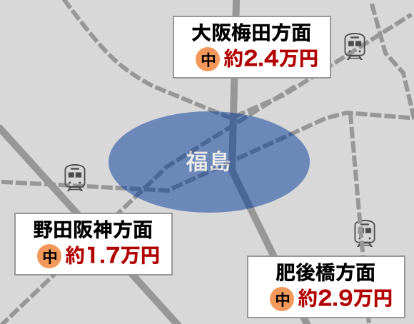 福島エリア周辺は、肥後橋方面、野田阪神方面、大阪梅田方面の3つのエリアに分けることができます。