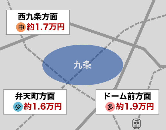 賃料相場で見ると最も相場価格が高いのはドーム前方面で約1.9万円、最も相場価格が低いのは弁天町方面で約1.6万円の駐車場があります。