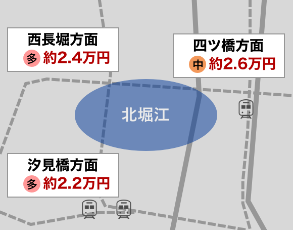北堀江エリア周辺は、四ツ橋方面、西長堀方面、汐見橋方面の3つのエリアに分けることができます。