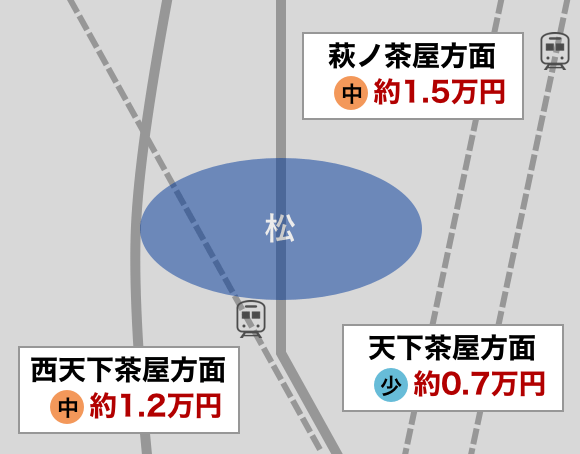 賃料相場で見ると最も相場価格が高いのは萩ノ茶屋方面で約1.5万円、最も相場価格が低いのは天下茶屋方面で約0.7万円の駐車場があります。
