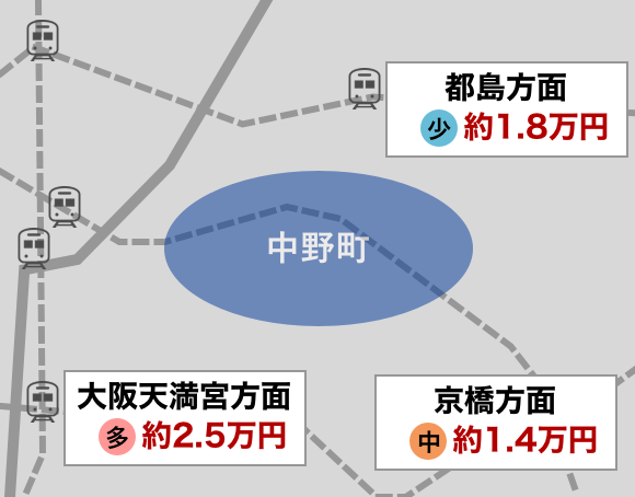 中野町エリア周辺は、京橋方面、大阪天満宮方面、都島方面の3つのエリアに分けることができます。