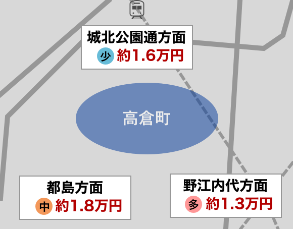 高倉町エリア周辺は、城北公園通方面、都島方面、野江内代方面の3つのエリアに分けることができます。