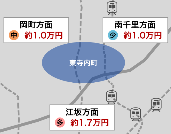 東寺内町エリア周辺は、南千里方面、岡町方面、江坂方面の3つのエリアに分けることができます。