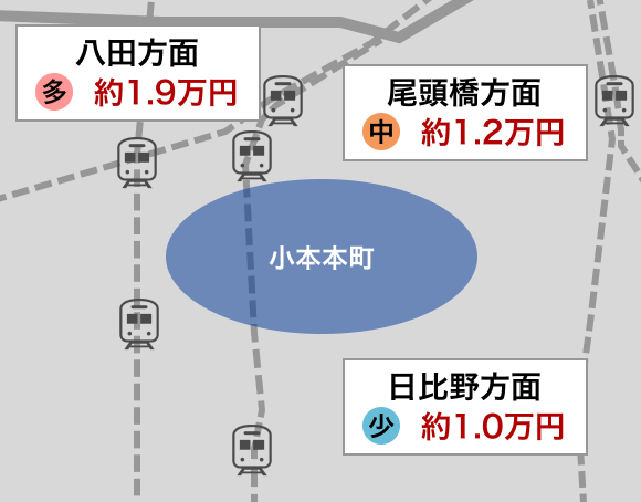 小本本町エリア周辺は、尾頭橋方面、八田方面、日比野方面の3つのエリアに分けることができます。