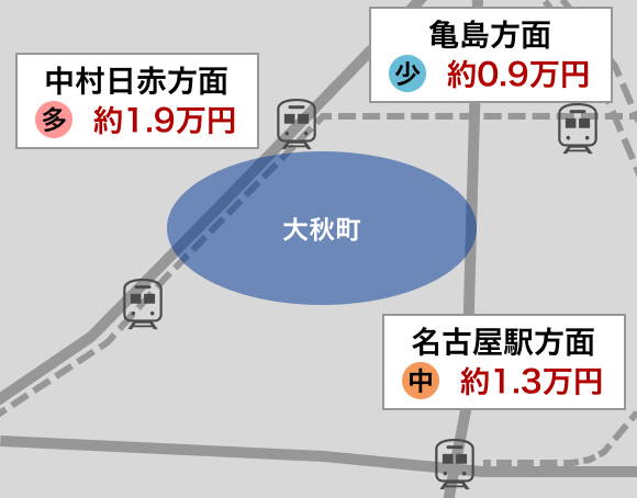大秋町エリア周辺は、亀島方面、中村日赤方面、名古屋駅方面の3つのエリアに分けることができます。