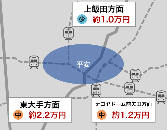 平安エリア周辺は、上飯田方面、東大手方面、ナゴヤドーム前矢田方面の3つのエリアに分けることができます。