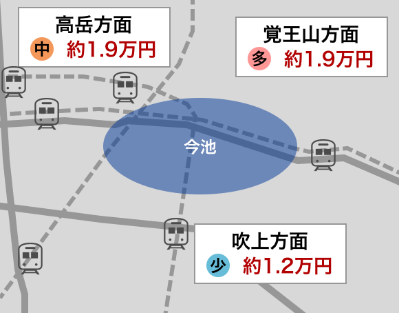 今池エリア周辺は、吹上方面、高岳方面、覚王山方面の3つのエリアに分けることができます。