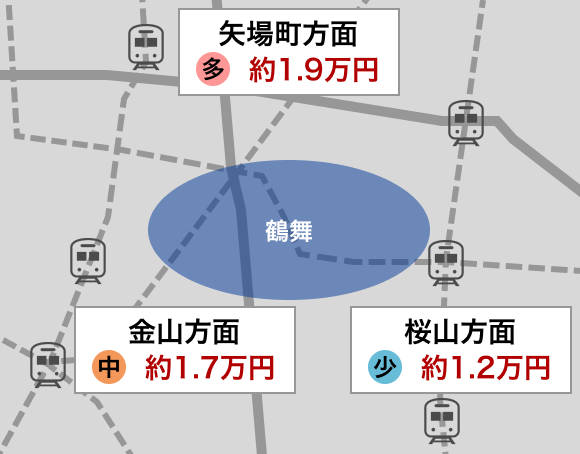 鶴舞エリア周辺は、桜山方面、矢場町方面、金山方面の3つのエリアに分けることができます。