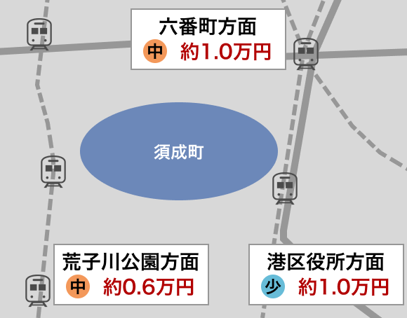 須成町エリア周辺は、荒子川公園方面、港区役所、六番町方面の3つのエリアに分けることができます。
