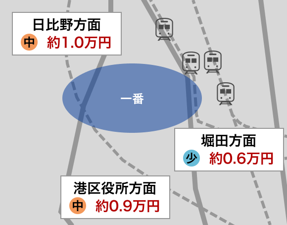 一番エリア周辺は、日比野方面、堀田方面、港区役所方面の3つのエリアに分けることができます。