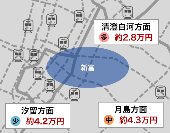 賃料相場で見ると最も相場価格が高いのは月島方面で約4.3万円、最も相場価格が低いのは清澄白河方面で約2.8万円の駐車場があります。