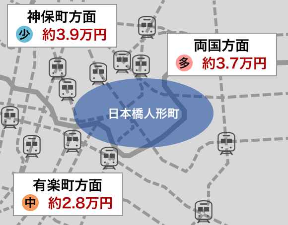 日本橋人形町エリア周辺は、有楽町方面、神保町方面、両国方面の3つのエリアに分けることができます。