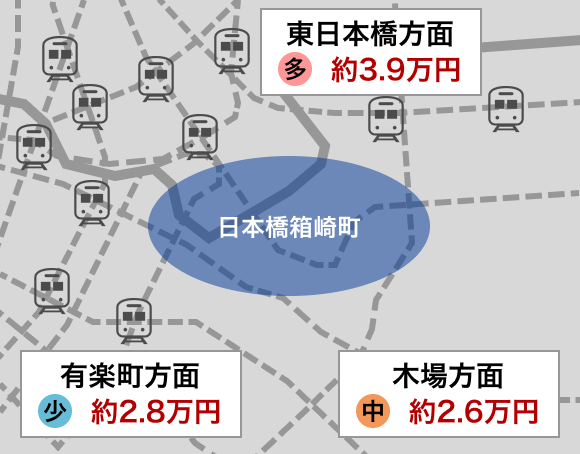 日本橋箱崎町エリア周辺は、木場方面、東日本橋方面、有楽町方面の3つのエリアに分けることができます。