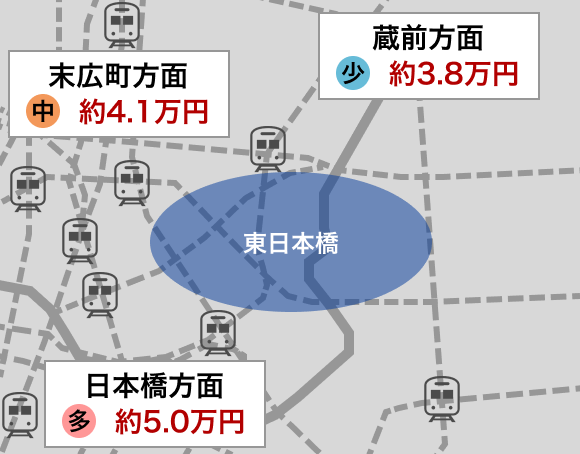 賃料相場で見ると最も相場価格が高いのは日本橋方面で約5.0万円、最も相場価格が低いのは蔵前方面で約3.8万円の駐車場があります。
