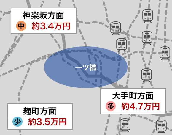 一ツ橋エリア周辺は、神楽坂方面、麹町方面、大手町方面の3つのエリアに分けることができます。