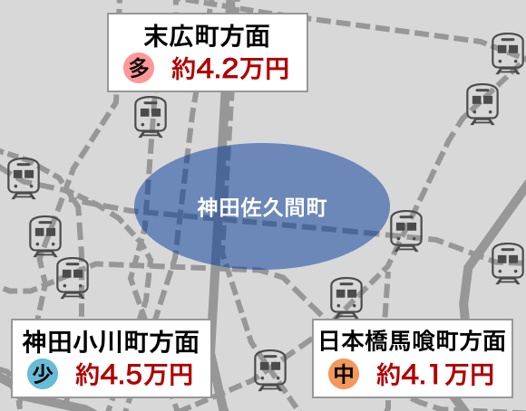 賃料相場で見ると最も相場価格が高いのは神田小川町方面で約4.5万円、最も相場価格が低いのは日本橋馬喰町方面で約4.1万円の駐車場があります。