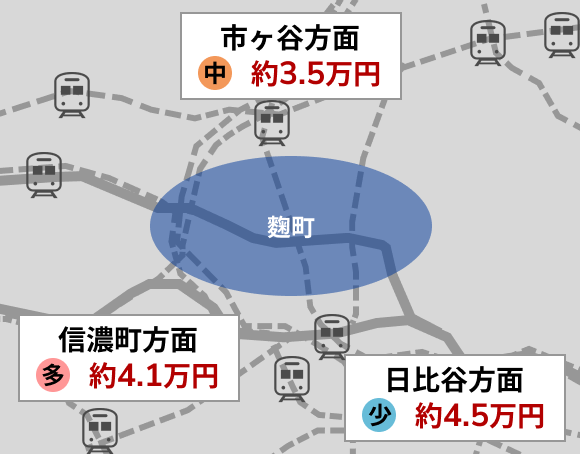 賃料相場で見ると最も相場価格が高いのは日比谷方面で約4.5万円、最も相場価格が低いのは市ヶ谷方面で約3.5万円の駐車場があります。