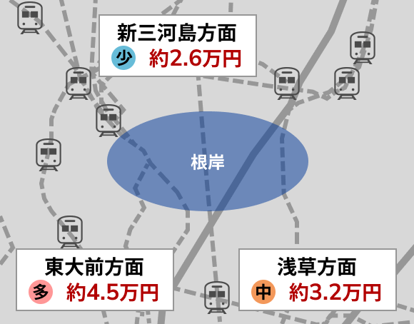 根岸エリア周辺は、浅草方面、東大前方面、新三河島方面の3つのエリアに分けることができます。