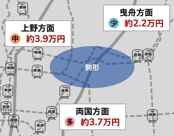 駒形エリア周辺は、曳舟方面、上野方面、両国方面の3つのエリアに分けることができます。
