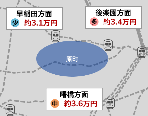 原町エリア周辺は、早稲田方面、後楽園方面、曙橋方面の3つのエリアに分けることができます。
