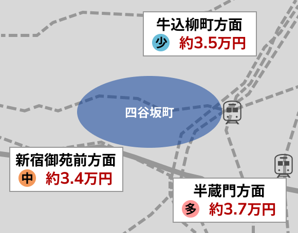 四谷坂町エリア周辺は、牛込柳町方面、新宿御苑前方面、半蔵門方面の3つのエリアに分けることができます。