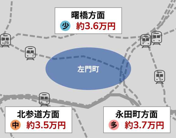 左門町エリア周辺は、永田町方面、北参道方面、曙橋方面の3つのエリアに分けることができます。