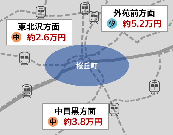 桜丘町エリア周辺は、東北沢方面、中目黒方面、外苑前方面の3つのエリアに分けることができます。