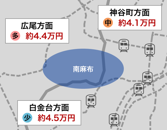 南麻布エリア周辺は、神谷町方面、白金台方面、広尾方面の3つのエリアに分けることができます。