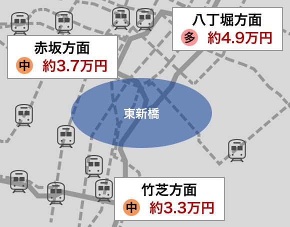 東新橋エリア周辺は、竹芝方面、八丁堀方面、赤坂方面の3つのエリアに分けることができます。