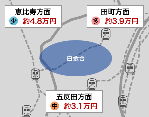 白金台エリア周辺は、五反田方面、田町方面、恵比寿方面の3つのエリアに分けることができます。