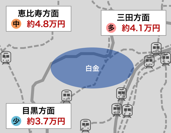 白金エリア周辺は、目黒方面、三田方面、恵比寿方面の3つのエリアに分けることができます。