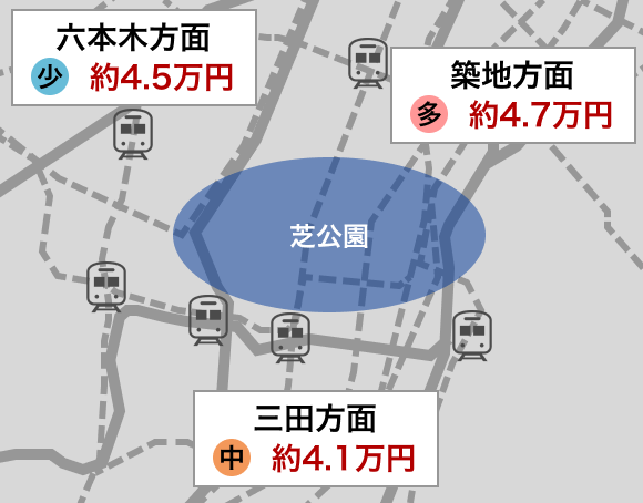 賃料相場で見ると最も相場価格が高いのは築地方面で約4.7万円、最も相場価格が低いのは三田方面で約4.1万円の駐車場があります。