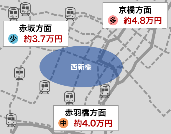 賃料相場で見ると最も相場価格が高いのは京橋方面で約4.8万円、最も相場価格が低いのは赤坂方面で約3.7万円の駐車場があります。
