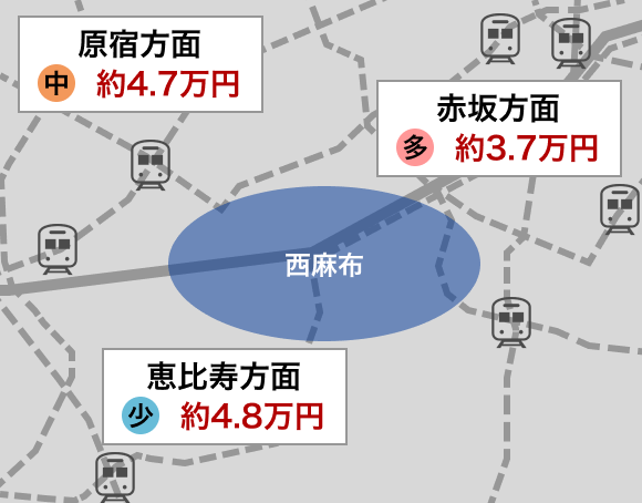 賃料相場で見ると最も相場価格が高いのは恵比寿方面で約4.8万円、最も相場価格が低いのは赤坂方面で約3.7万円の駐車場があります。