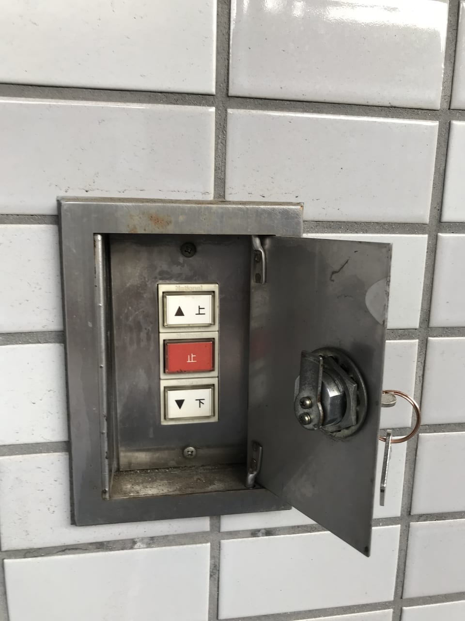駐車場によっては、シャッターの開閉が手動で行えるよう、入口の脇などに開閉ボタンが設置されていることがあります。